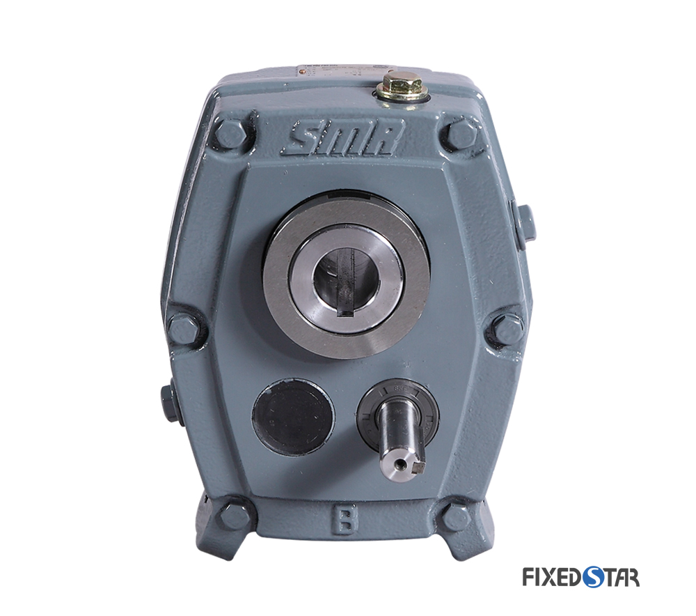 SMR、SMRY. SMR-R轴装式减速机结构紧凑,承载能力大,传动效率高(单级齿轮传动效率高达98.5% ),传动平稳,噪声低,性能可靠,广泛应用于矿山、冶金、.工程机械等行业.输出空心轴的两端均有锥度部分,使用各种不同的输出锥套可实现不同的输出孔大小,锥套孔符合ANSI美制标准,同时也备有ISO标准的公制直孔输出轴供客户选用.箱体采用高强度铸铁精密铸造,具有优良的减振缓冲击能力。齿轮采用高强度合金钢材料,渗碳淬火,磨齿工艺,渐开线齿形修形。逆止器可用于减速机不能反转的使用条件,扭力臂可用来安装调整减速机的空间位置及皮带的松紧。